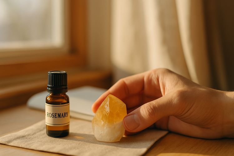 Fique nesse estado por alguns minutos. Deixe o citrino sobre sua mesa de trabalho ou carregue-o com você. Ao longo do dia, sempre que sentir confusão ou cansaço mental, inspire novamente o óleo de alecrim ou toque o cristal por alguns segundos para retomar seu eixo.